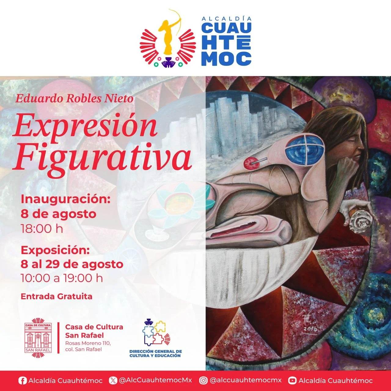La Alcaldía Cuauhtémoc, a través de la Dirección General de Cultura y Educación y la Casa de Cultura San Rafael, tiene el honor de invitarle a la inauguración de la exposición: Expresión Figurativa del artista Eduardo Robles Nieto