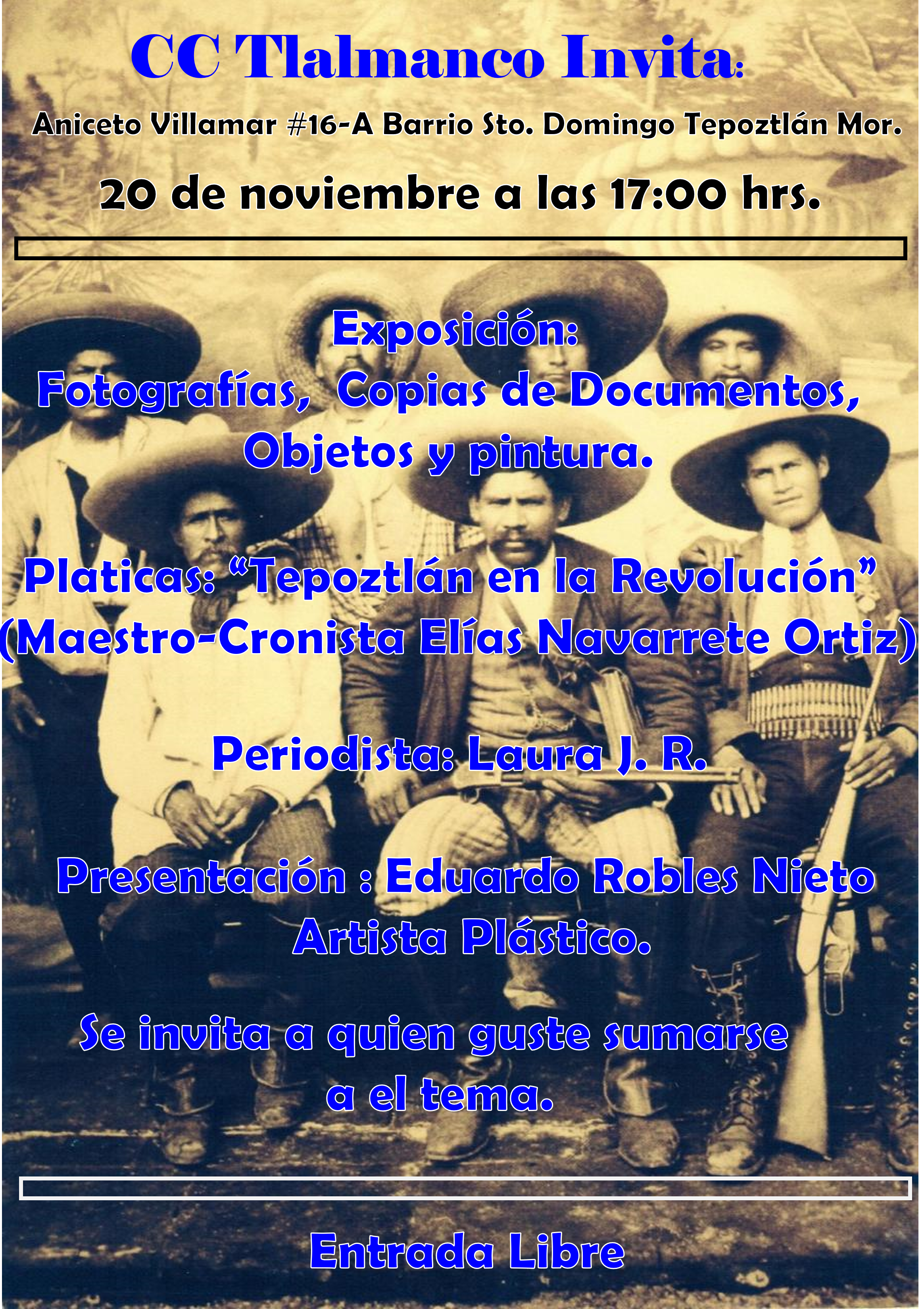 El Centro Cultural Tlamanco te invita a una tarde especial dedicada a la historia y la memoria de Tepoztlán con motivo del aniversario de la Revolución Mexicana.